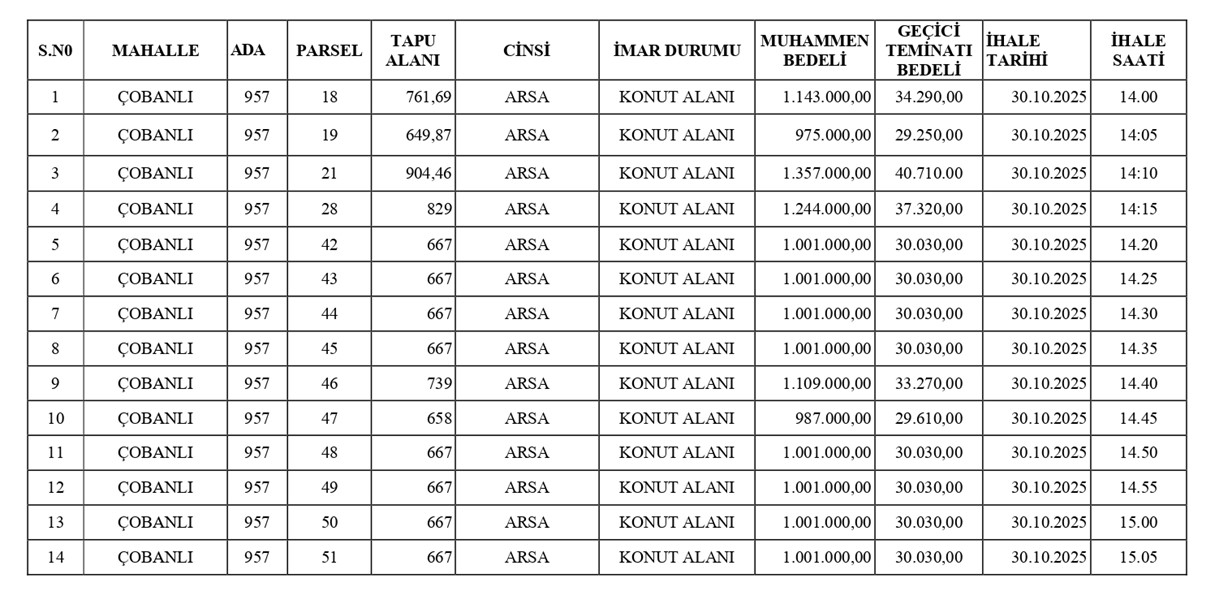 Aşağıda nitelikleri belirtilen Mülkiyeti Arapgir Belediye Başkanlığına ait İlçemiz Çobanlı Mahallesinde bulunan 957 Ada 18, 19, 21, 28, 42, 43, 44, 45, 46, 47, 48, 49, 50 ve 51 sayılı 14 Taşınmaz (Arsa) mevcut halleriyle 2886 Sayılı Kamu İhale Kanununun 45 inci maddesine göre Açık Teklif Usulü ile İhale edilerek satılacaktır.